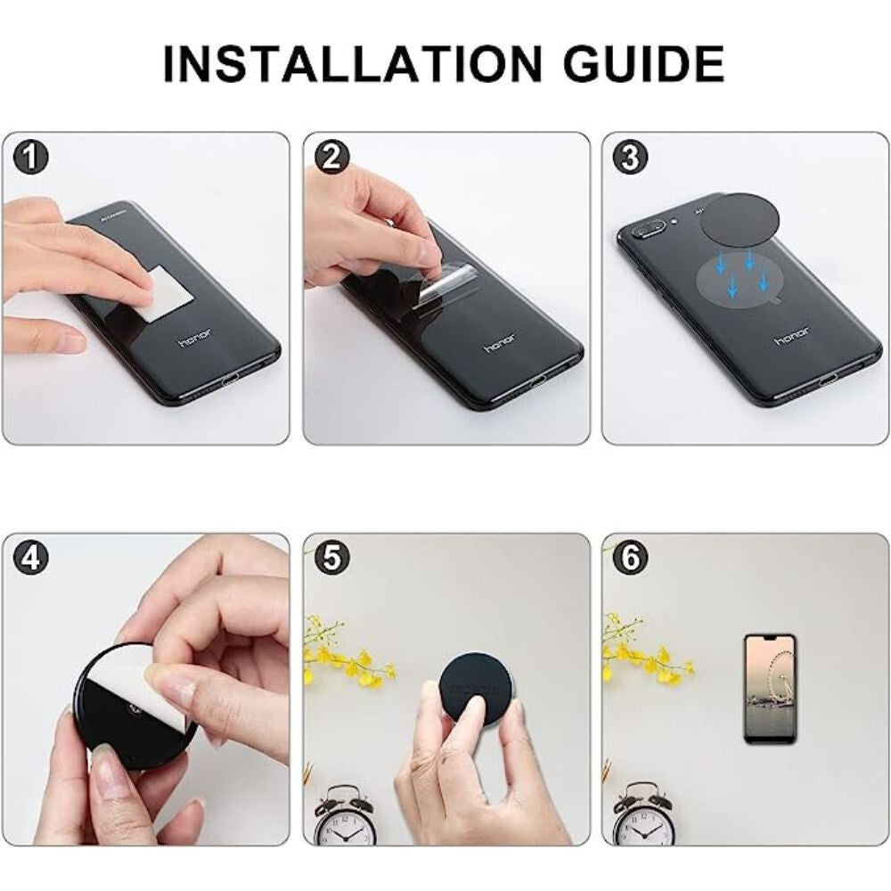 - Łatwy montaż: do magnetycznego uchwytu dołączone są 4 metalowe płytki, które ułatwiają instalację – wystarczy przykleić je do dowolnej płaskiej powierzchni. Podstawa uchwytu wykonana jest z miękkiej, wysokiej jakości gumy, aby nie porysować Twojego urządzenia.