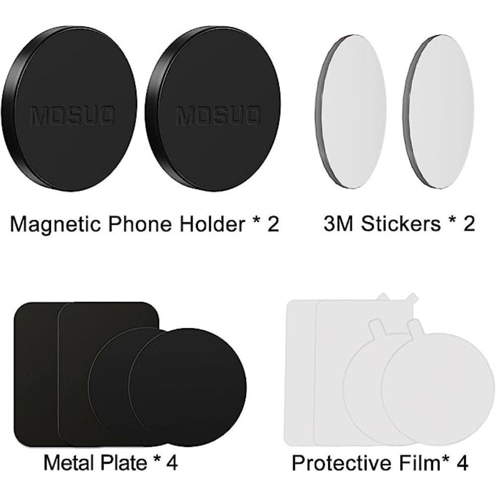 - przed pierwszym użyciem magnetycznego uchwytu upewnij się, że powierzchnia deski rozdzielczej jest czysta. Po przyklejeniu uchwytu odczekaj co najmniej 6 godzin, aż klej się utrwali. - Zawartość opakowania: 2x magnetyczny uchwyt Mosuo, 2 okrągłe metalowe płytki, 2 prostokątne metalowe płytki, dwie samoprzylepne naklejki 3M.