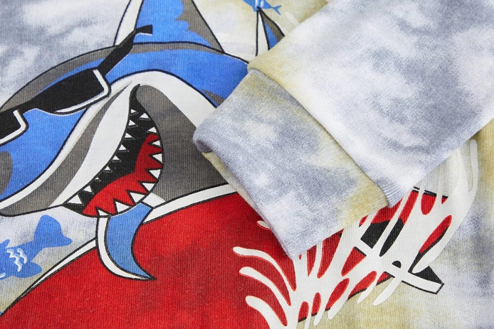- Wzór tie-dye i żywe kolory: Wzory dinozaurów i rekinów, które są ulubieńcami chłopców.