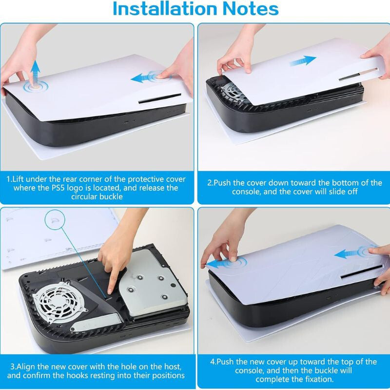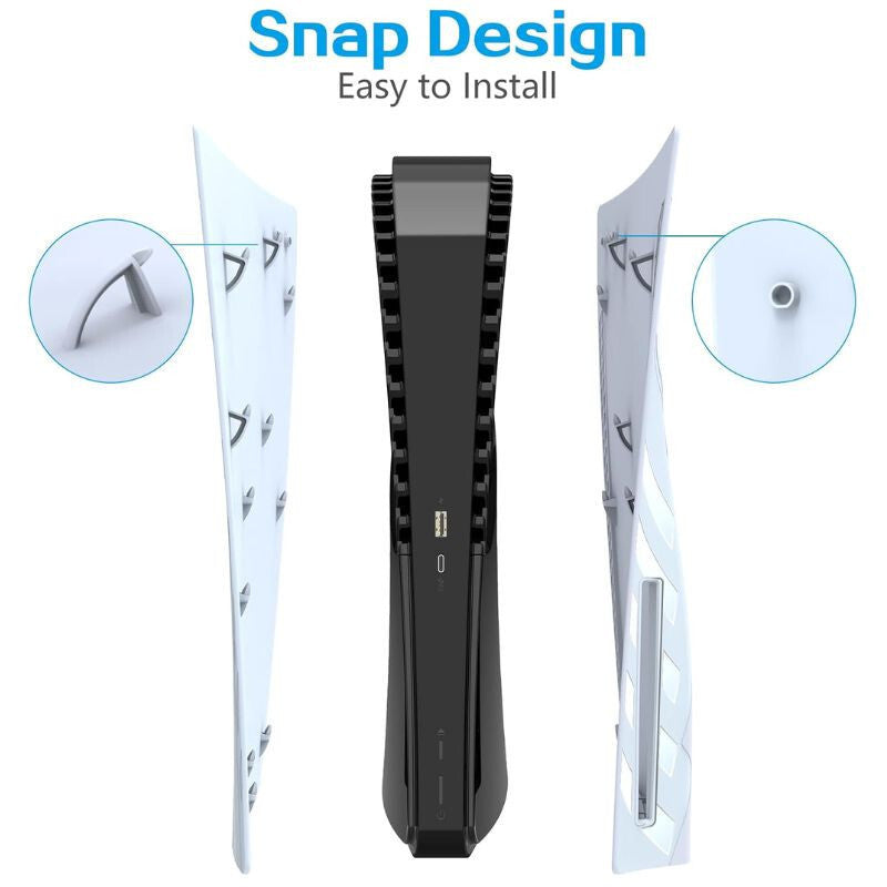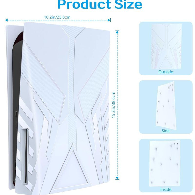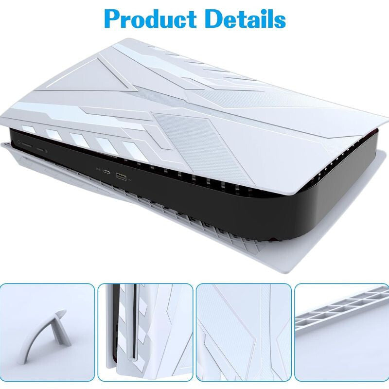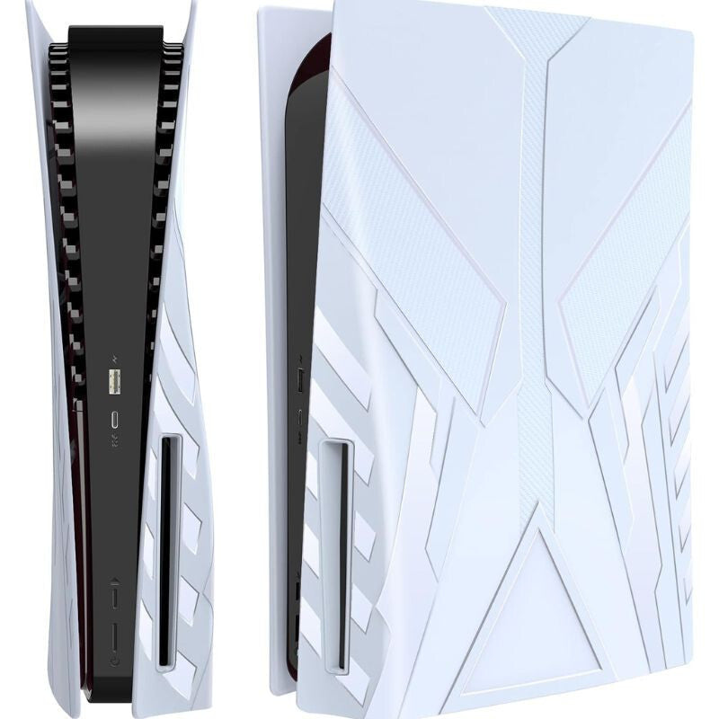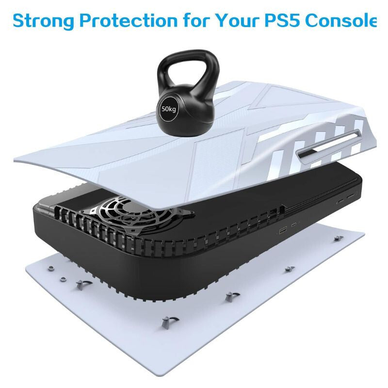- Wytrzymały materiał ABS: Przedni panel wykonany jest z odpornego na uderzenia tworzywa ABS, które chroni konsolę PS5 przed zarysowaniami i zapobiega osadzaniu się kurzu, a jednocześnie jest łatwy do czyszczenia.