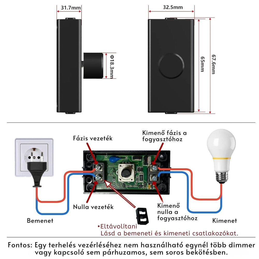 - Ściemniacz posiada wbudowaną ochronę przed przeciążeniem (LFP), która automatycznie wyłącza urządzenie w przypadku zbyt dużego obciążenia. Dzięki ustawieniom minimalnej i maksymalnej jasności można uniknąć migotania lub niestabilnej regulacji światła. Praktyczna konstrukcja z zaciskami ułatwia instalację.