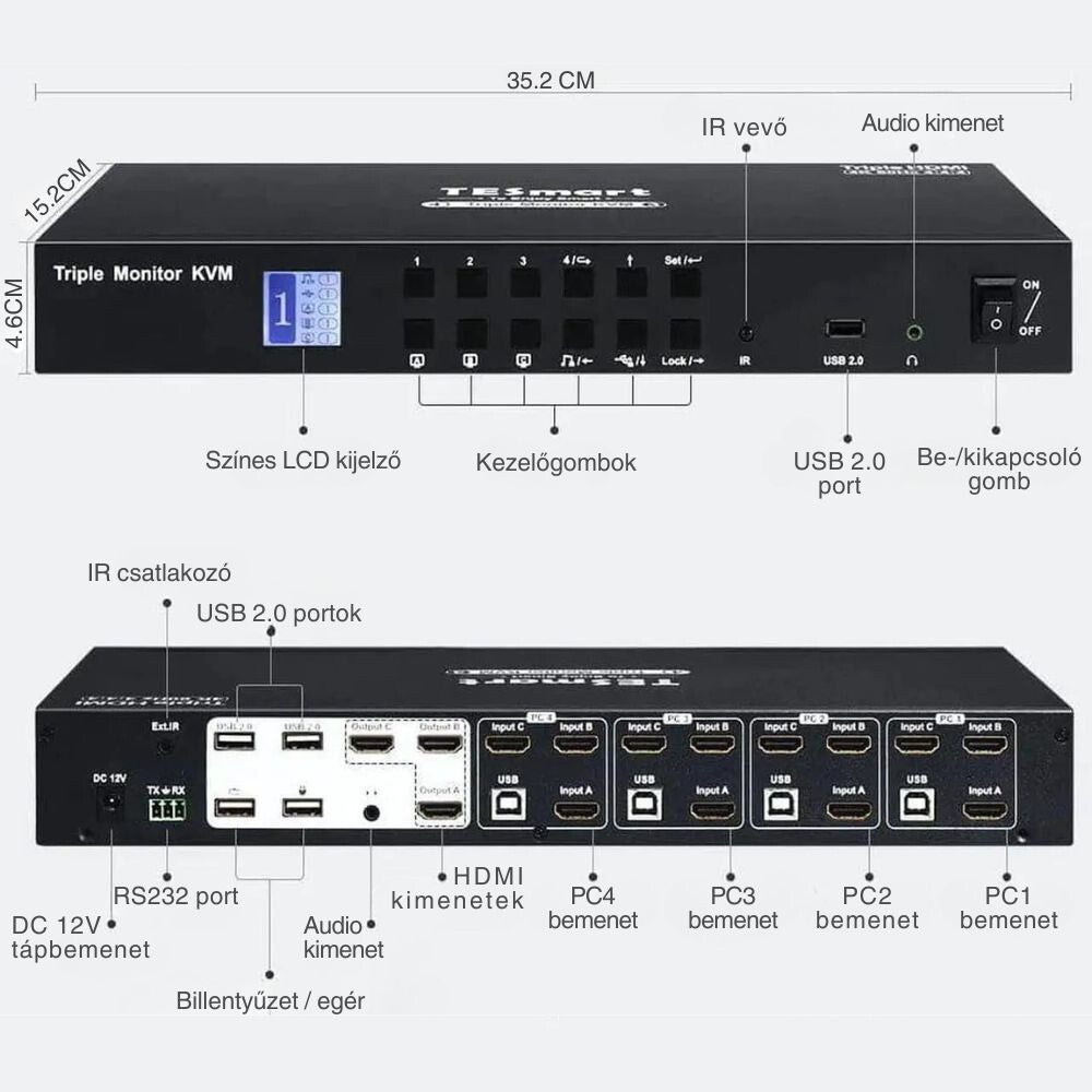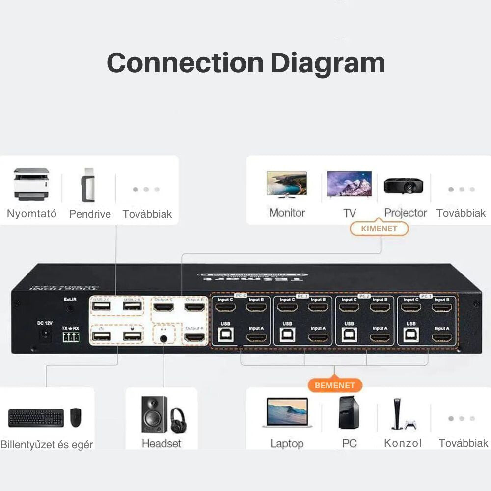 - Przełącznik KVM TESmart Triple Monitor HDMI – 4 Komputery, 3 Monitory, 4K 60Hz, Udostępnianie USB i Dźwięku