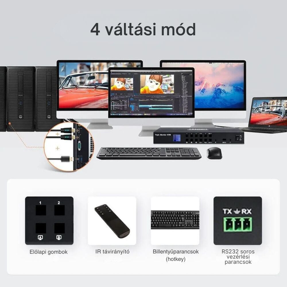 - Przełącznik KVM TESmart Triple Monitor to idealne rozwiązanie do pracy zdalnej i profesjonalnych stanowisk roboczych, gdzie trzeba obsługiwać kilka komputerów jednocześnie. Za pomocą jednej klawiatury i myszy można sterować nawet 4 komputerami na 3 monitorach, bez kompromisów.