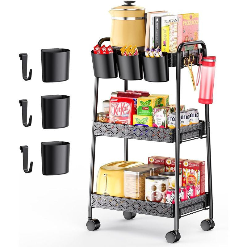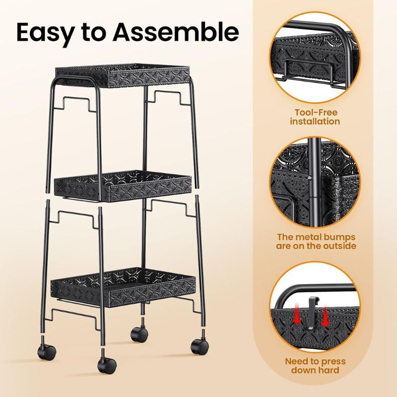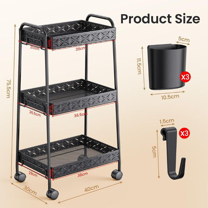 - PKBD 3-poziomowy metalowy wózek na kółkach - Czarny, 40 cm x 30 cm x 75,5 cm