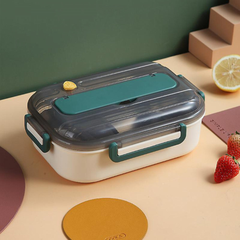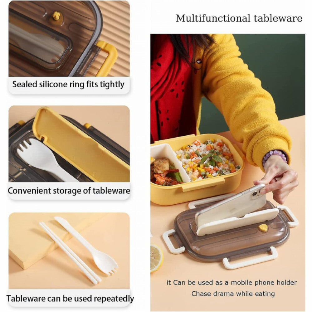 Pojemnik na przekąski z 2 przegródkami – szczelny, z miejscem na sztućce i możliwością użycia jako stojak na telefon