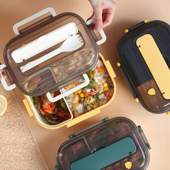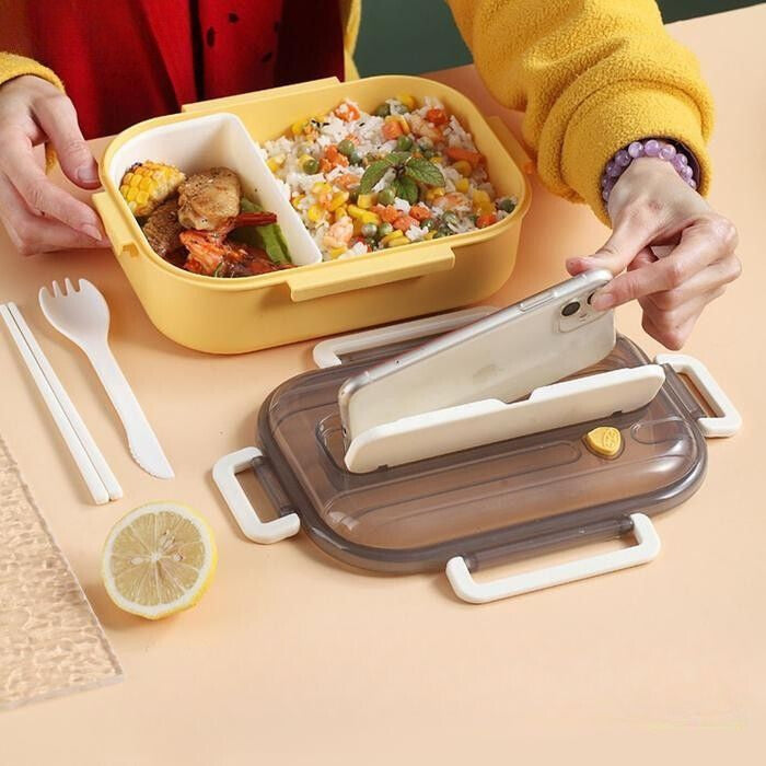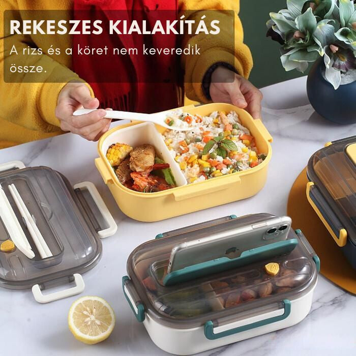 Praktyczna konstrukcja pozwala na oddzielenie potraw, dzięki czemu pozostają one świeże i smaczne. Wbudowany pojemnik na sztućce to higieniczne i wygodne rozwiązanie, które pełni również funkcję stojaka na telefon, dzięki czemu podczas jedzenia możesz cieszyć się ulubionymi treściami. -
