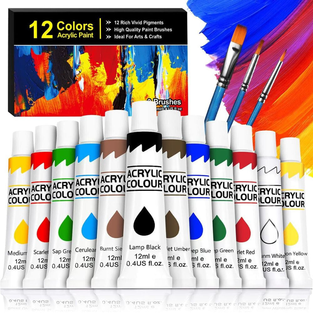 - Zestaw 12 sztuk farb akrylowych Gifort – Żywe Kolory, Doskonała Jakość, Kreatywne Tworzenie