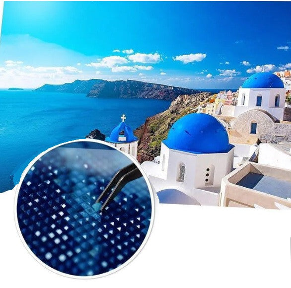 - Zestaw do malowania diamentami z motywem niebieskiej plaży i greckiej kopuły 35 x 25 cm