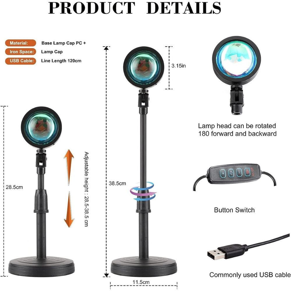 - Zamów obrotową o 180° USB LED lampę do projekcji zachodu słońca i ciesz się połączeniem nowoczesnej technologii z zachwycającym klimatem! To idealny wybór do dekoracji domu, relaksu lub kreatywnej pracy, a regulowane funkcje dają Ci pełną kontrolę.