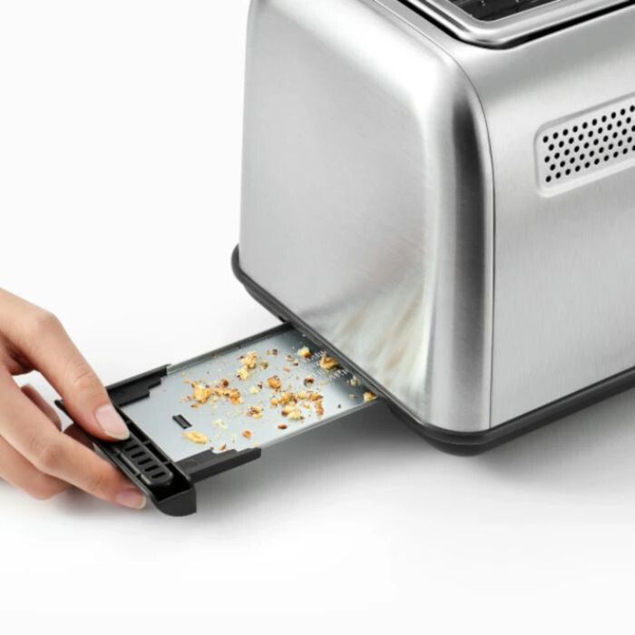- Urządzenie oferuje praktyczne rozwiązania ułatwiające codzienne użytkowanie: wysuwany dźwignia do łatwego wyjmowania kromek, wyjmowana tacka na okruchy do szybkiego czyszczenia, pokrywa chroniąca przed kurzem oraz wbudowany organizer na kabel dla zachowania porządku.