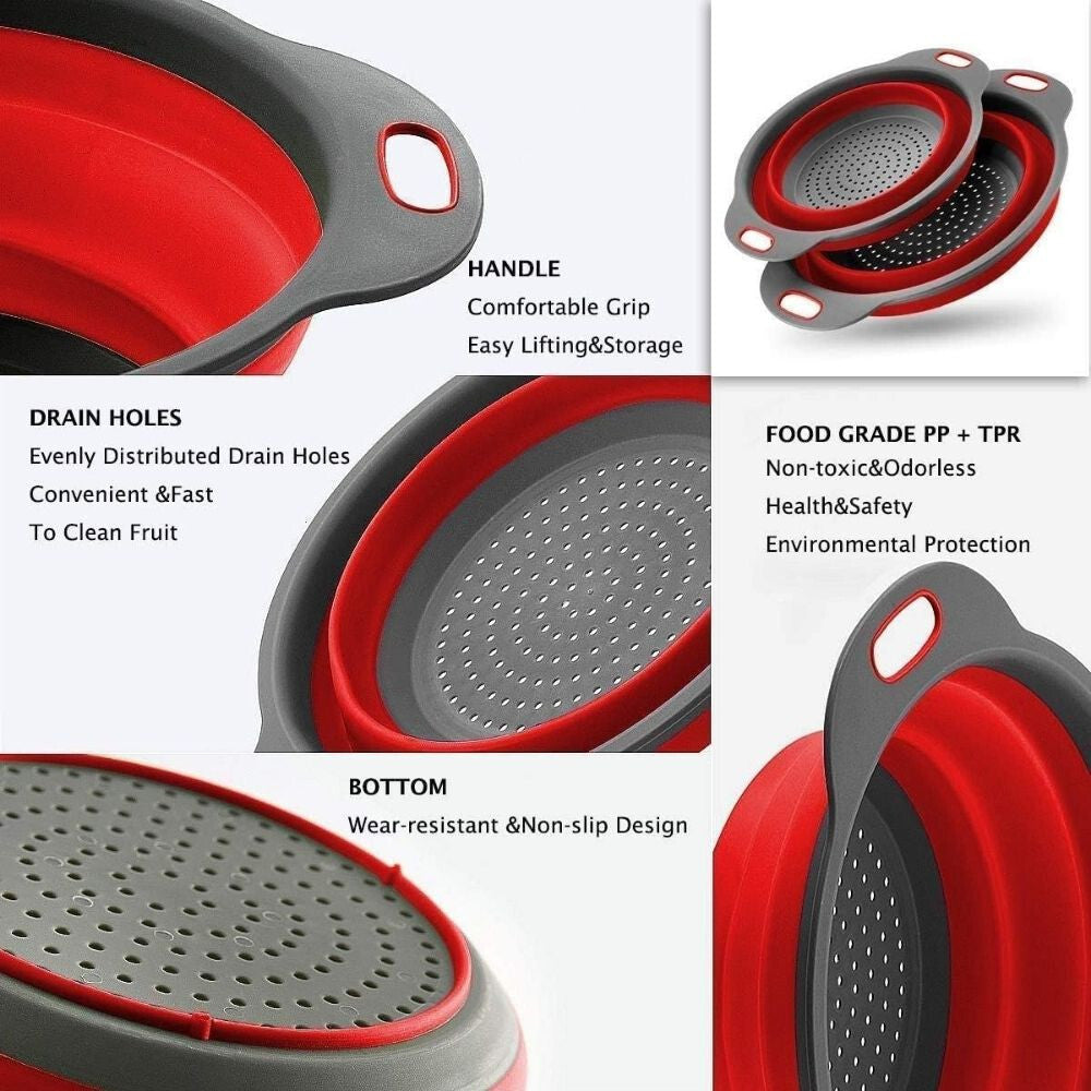 - To 2-częściowy składany zestaw sit, zawiera sita o różnych rozmiarach, idealne do odsączania makaronów, owoców, warzyw lub innych potraw. Mniejsze sito ma pojemność 1,3 litra, a większe 2,8 litra, aby sprostać wszelkim potrzebom. Wykonane z ekologicznego silikonu wolnego od BPA, który jest nietoksyczny, bezwonny i odporny na wysokie temperatury.