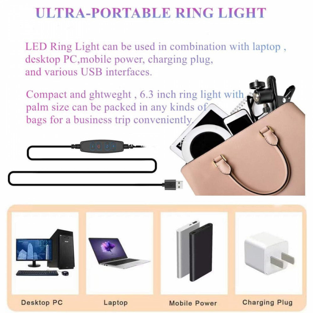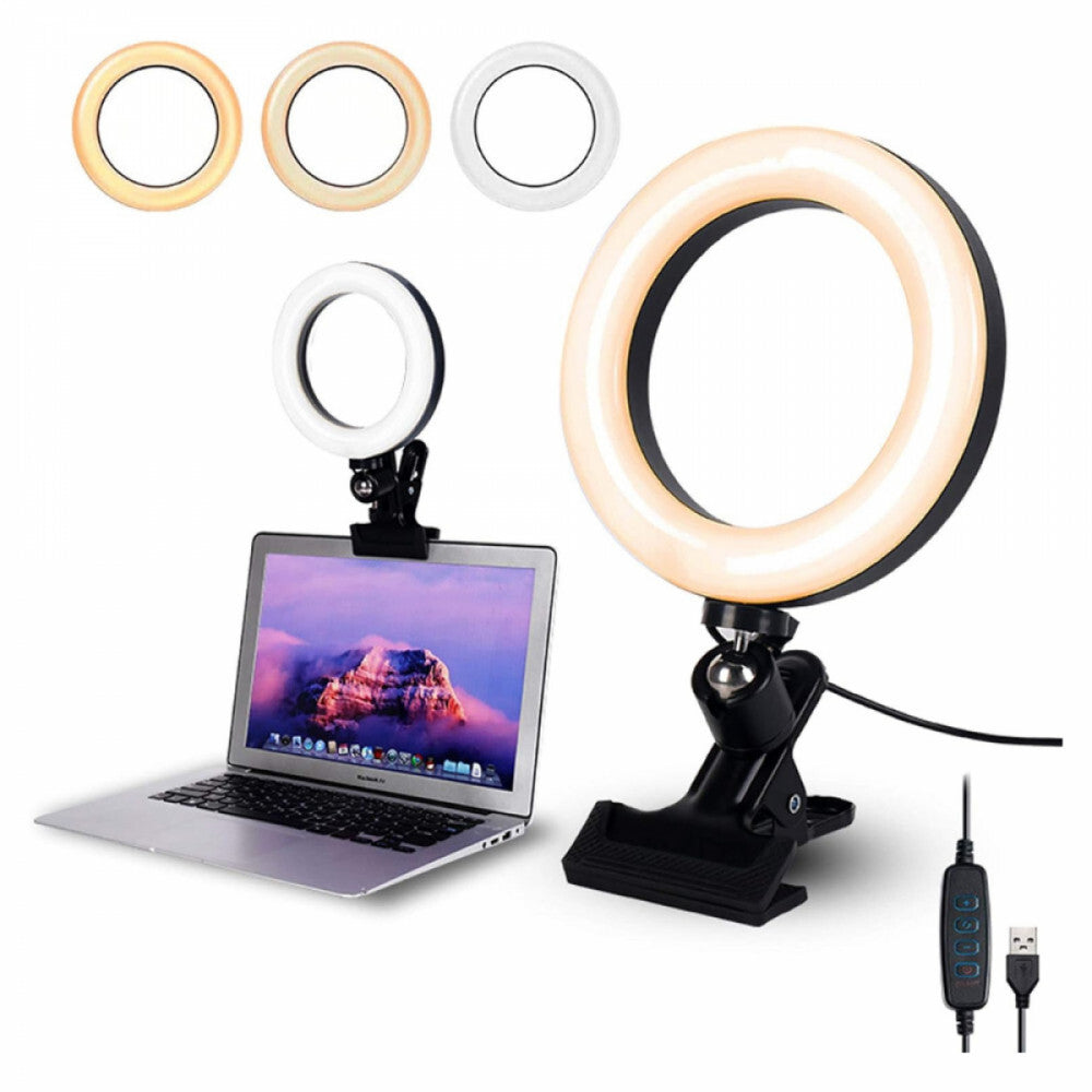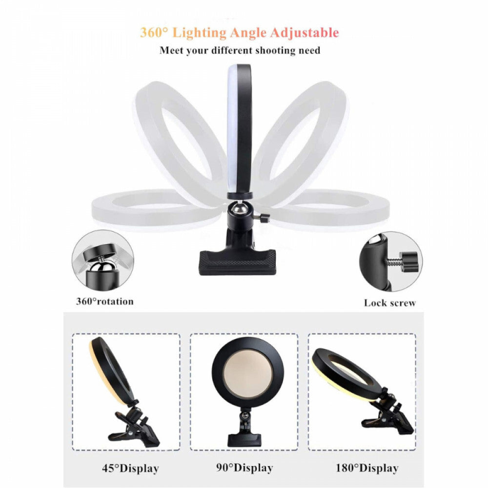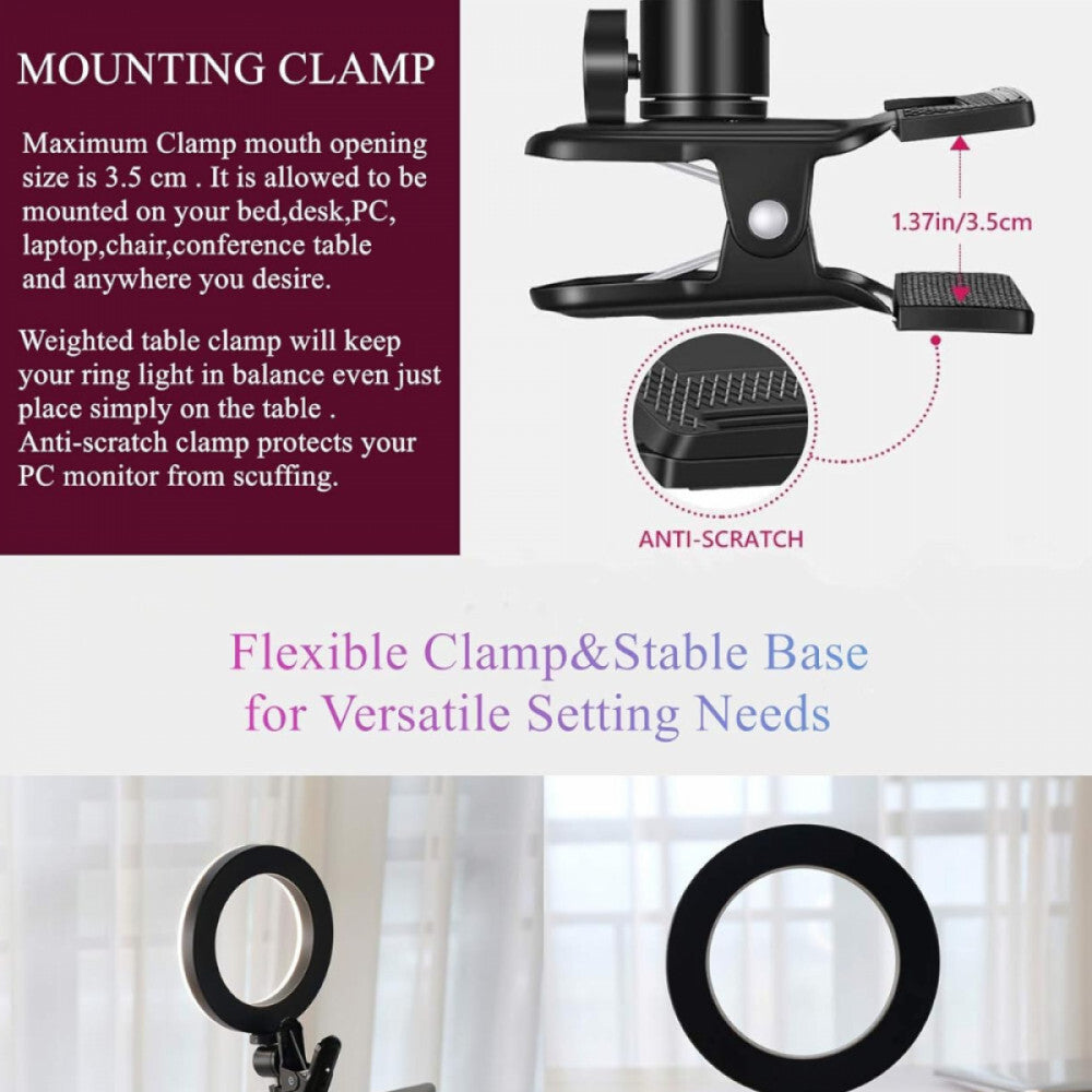 - Kompaktowa lampa pierścieniowa z zaciskiem montażowym: Kompaktowa konstrukcja o średnicy 16 cm, zacisk montażowy odporny na zarysowania (maksymalny rozwarcie: 3,5 cm/1,38 cala) pozwala na przymocowanie lampy do biurka, laptopa, krzesła, łóżka, stołu konferencyjnego lub nawet monitora komputera, laptopa i wszędzie tam, gdzie chcesz, zapewniając mocną stabilność. Obciążony metalowy zacisk utrzymuje lampę pierścieniową LED w równowadze, nawet gdy położysz ją bezpośrednio na stole.