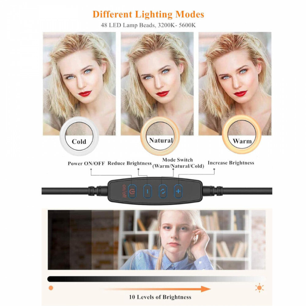 - Regulowana jasność i kolor: Lampa pierścieniowa LED ma 3 kolory światła: ciepły, ciepła biel i biel. Każdy tryb oświetlenia oferuje 10 różnych poziomów jasności. Temperatura barwowa jest regulowana w zakresie od 3200K (ciepła) do 5600K (zimna). Żywe kolory tworzą wyjątkowy nastrój i spełniają różnorodne potrzeby użytkownika.