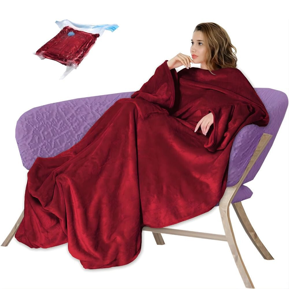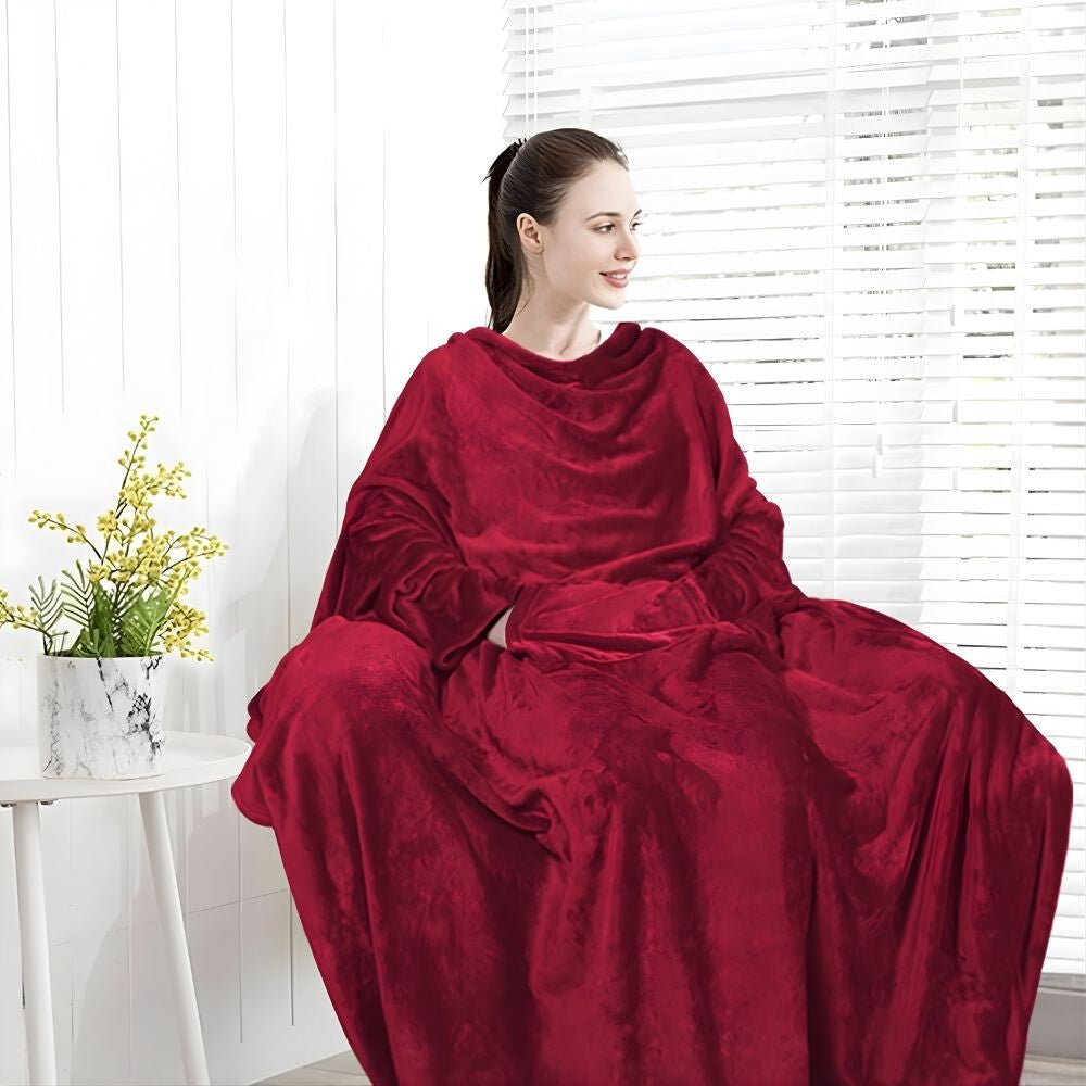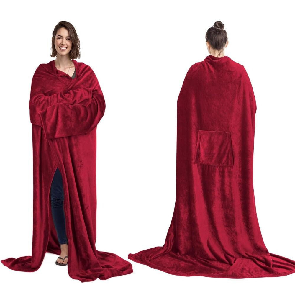 - Noszony koc z otworami na ręce i kieszenią – wyjątkowo miękki, bordowy wariant