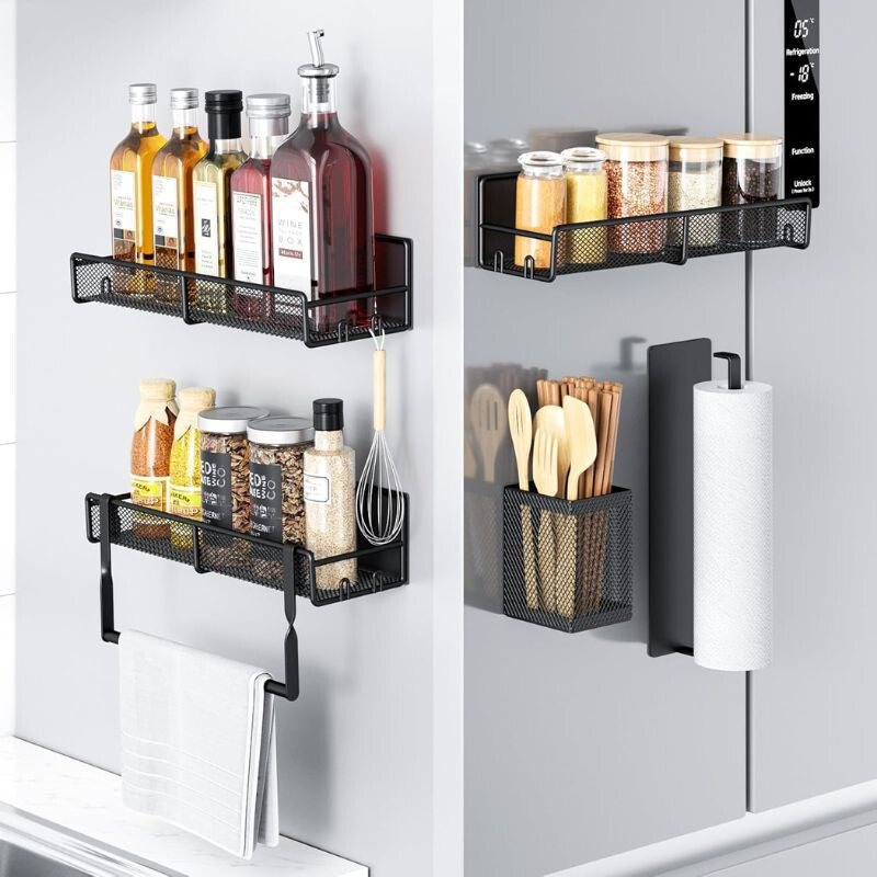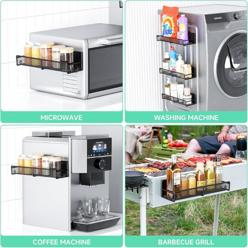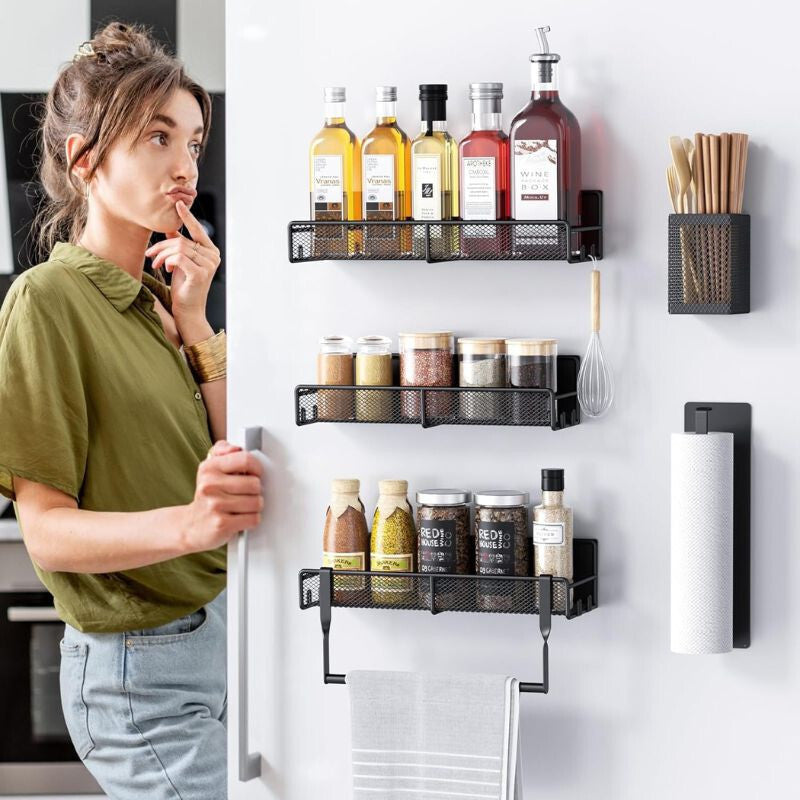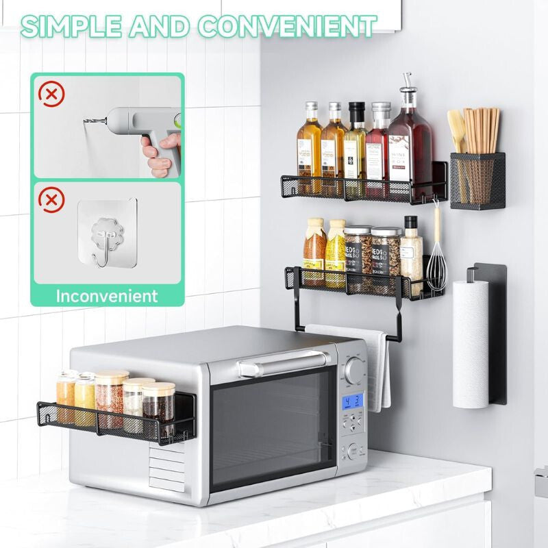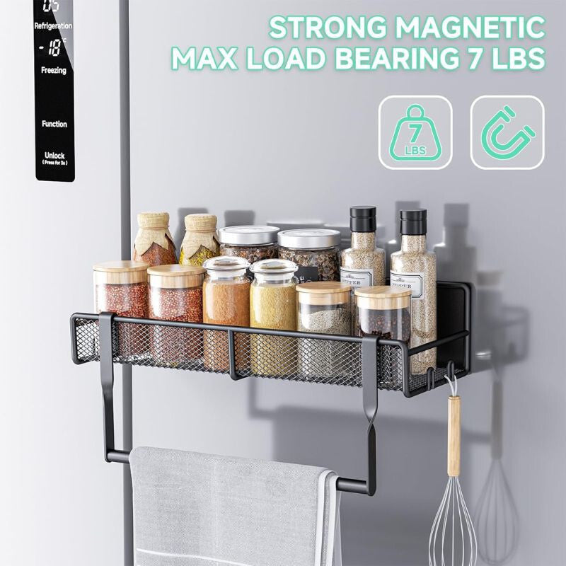 - Zestaw wykonany jest z trwałej stali nierdzewnej, odpornej na korozję i zapewniającej długą żywotność. Bardzo mocne magnetyczne mocowanie wytrzymuje obciążenie do 5 kg, dzięki czemu półki stabilnie przylegają do lodówek, mikrofalówek lub dowolnych metalowych powierzchni – wszystko to bez wiercenia i montażu.