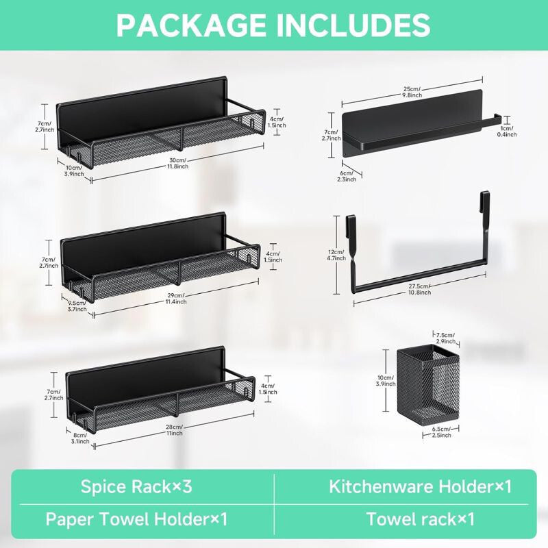 - Zestaw zawiera 3 półki na przyprawy, 1 uchwyt na ręcznik papierowy, 1 uchwyt na przybory kuchenne oraz 1 wieszak na ręcznik, które pomogą Ci łatwo uporządkować kuchenne akcesoria. Największa półka ma wymiary 32 x 11,3 x 11,2 cm i oferuje dużo miejsca na często używane przyprawy i narzędzia.