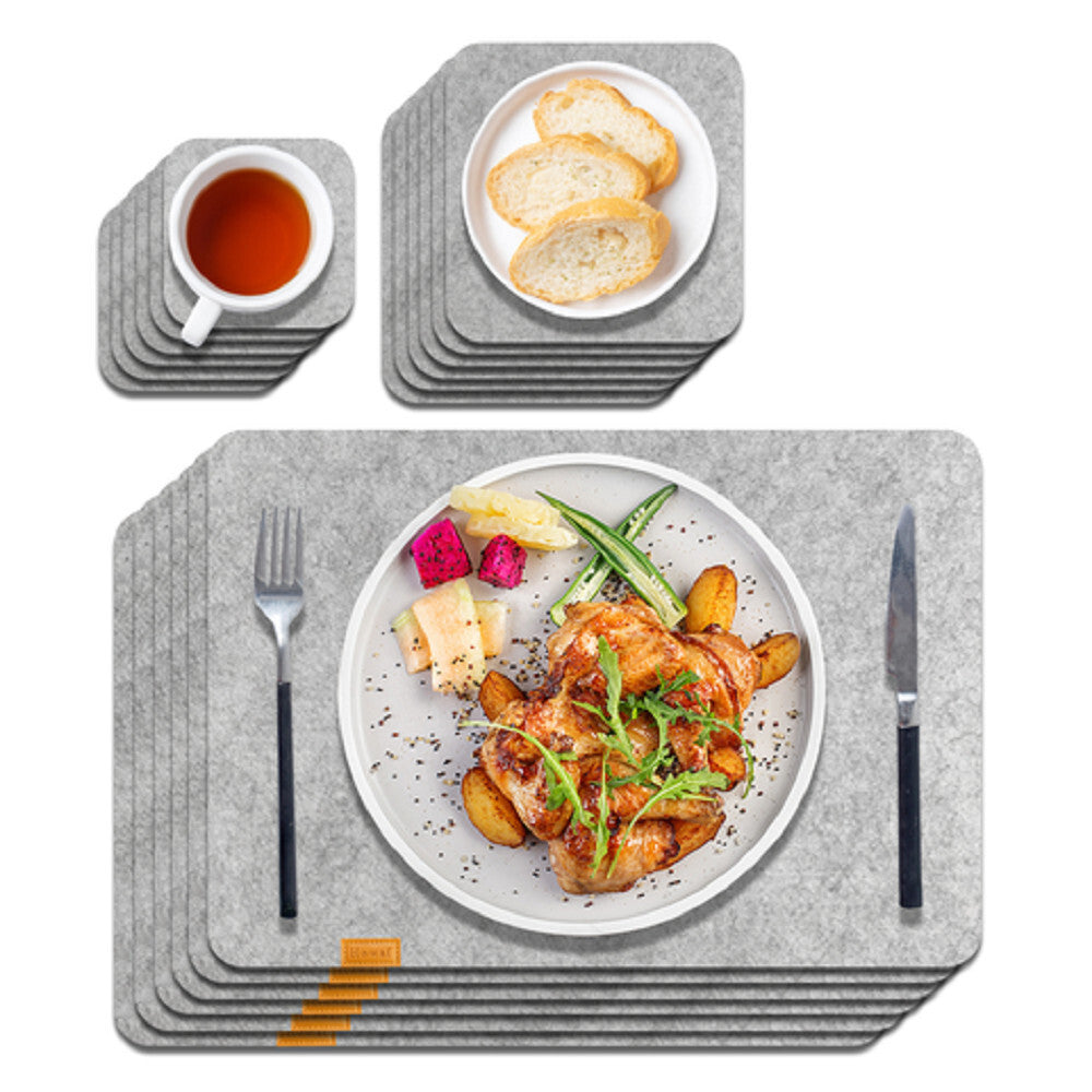 Zestaw zawiera 6 podkładek pod talerze, 6 pod kubki oraz 6 pod miski sałatkowe, zapewniając pełną ochronę stołu jadalnianego. Niezależnie od tego, czy to rodzinna kolacja, przyjęcie gości czy codzienny posiłek, zestaw gwarantuje estetyczny i uporządkowany wygląd stołu.