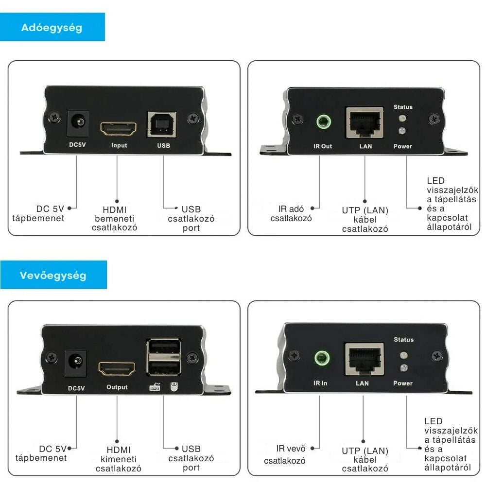 Nadajnik łączy się z komputerem lub odtwarzaczem multimedialnym za pomocą kabla HDMI i USB, a następnie przesyła sygnał do jednostki odbiorczej przez kabel UTP.