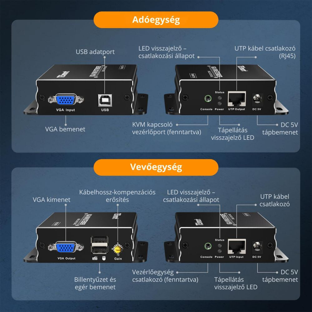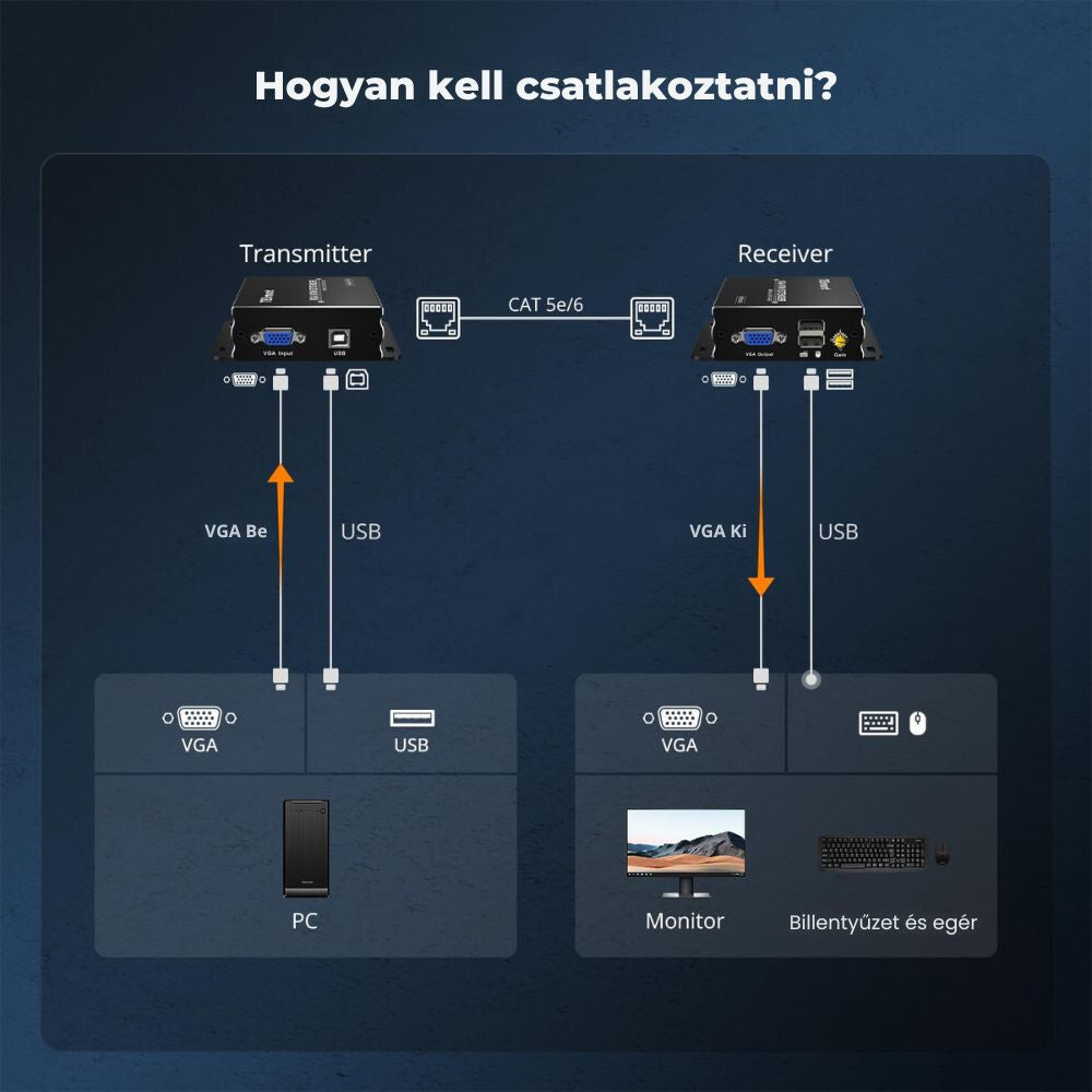 - Ten extender VGA–KVM umożliwia przesyłanie sygnału wideo VGA oraz sterowanie klawiaturą i myszą na duże odległości jednym kablem sieciowym Cat5e lub Cat6 UTP. Idealne rozwiązanie do biur, sal konferencyjnych, systemów bezpieczeństwa, środowisk edukacyjnych i przemysłowych.