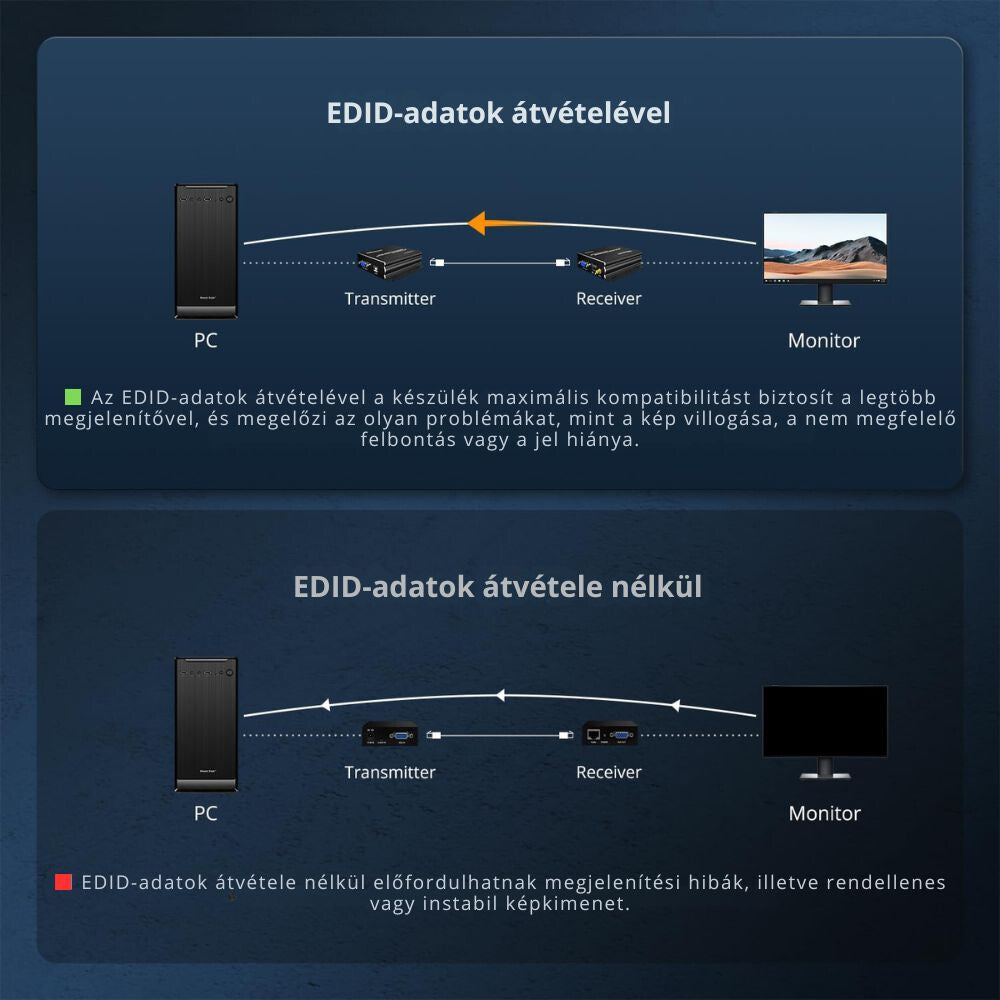 - Transmisja EDID przez kabel UTP, szeroka kompatybilność