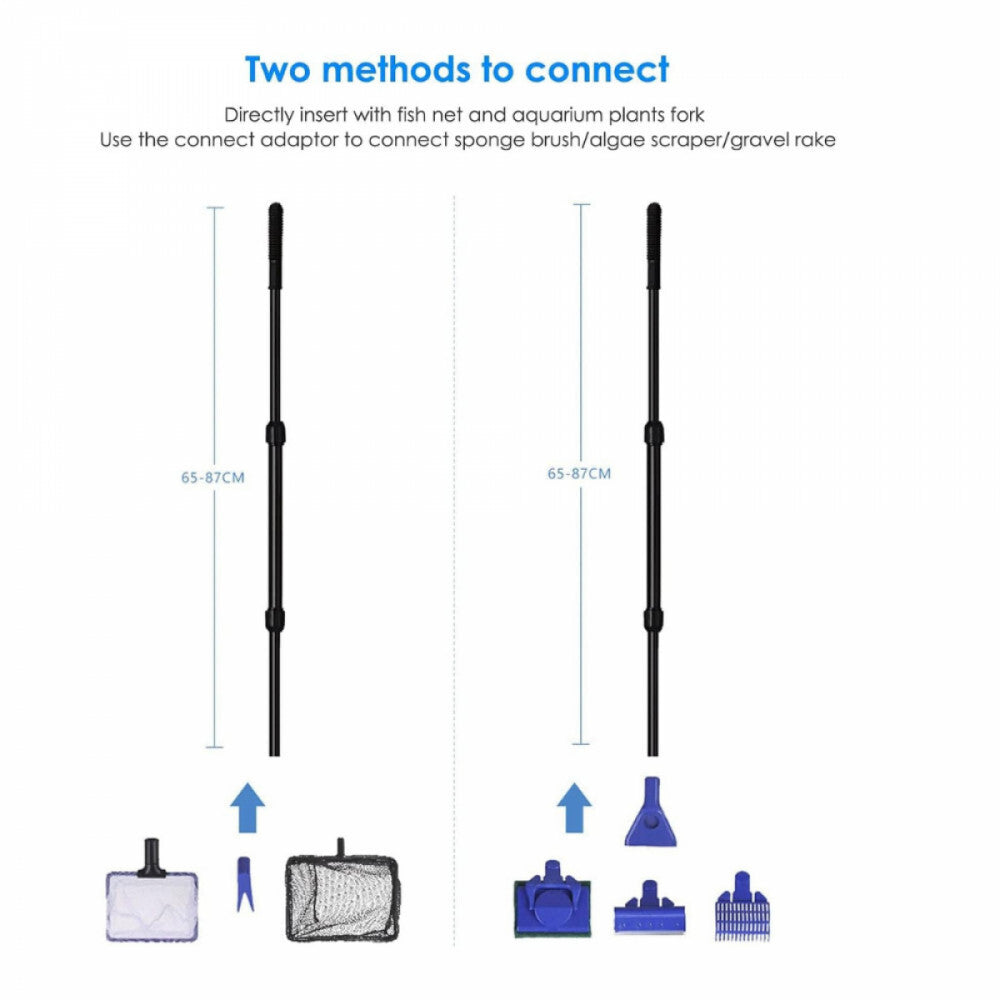 - Wszechstronne zastosowanie – Do drążka czyszczącego można podłączyć 6 różnych końcówek: siatkę do ryb, widelec do roślin, skrobak do glonów, szczotkę gąbkową, grabie do żwiru. Montaż jest prosty i szybki, a dzięki adapterowi każde narzędzie jest stabilnie zamocowane.