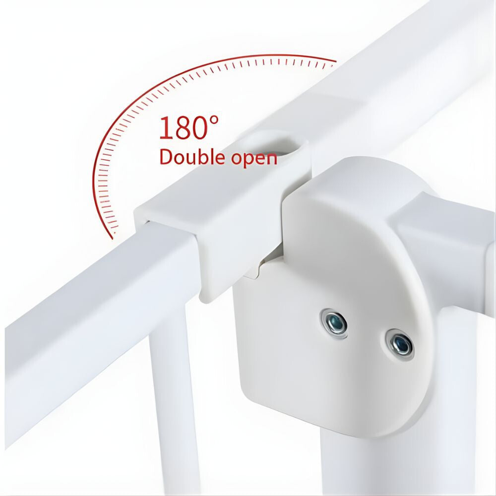 Zamek posiada dwie blokady: jedną u góry i jedną u dołu. Bramkę można otworzyć tylko przez jednoczesne naciśnięcie dwóch przycisków, dzięki czemu małe dzieci nie są w stanie jej przypadkowo otworzyć. Dodatkowy ręczny zamek na dole bramki zapewnia maksymalną ochronę. - Dwukierunkowe otwieranie